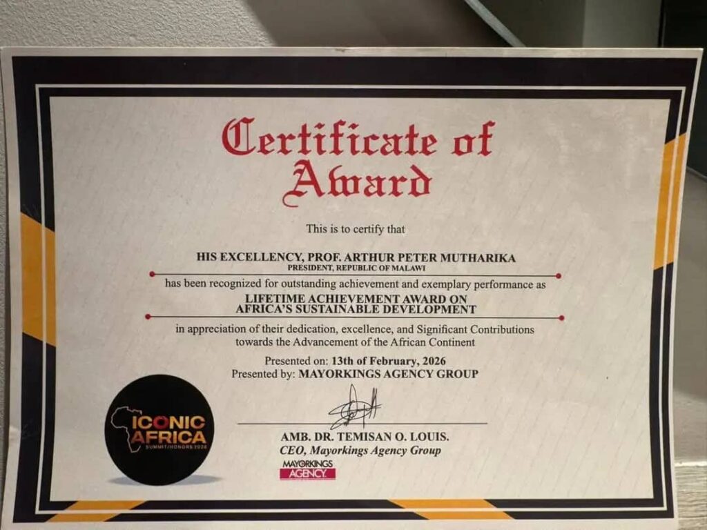 Speaking after receiving the honour, Phiri said the recognition is a clear testament to President Mutharika’s unwavering dedication to Malawi and Africa’s broader development agenda. He noted that the award reflects Mutharika’s strong commitment to democratic values, good governance, and people-centred development, which continue to resonate beyond Malawi’s borders.